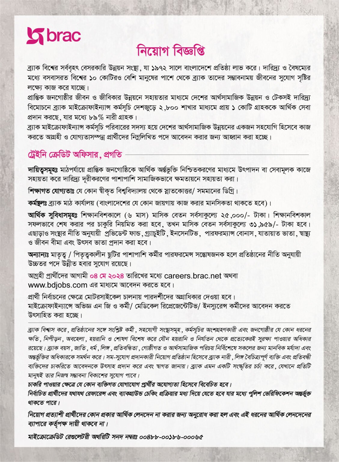 Interested candidates By 04 May 2024 careers.brac.net or Apply through www.bdjobs.com.